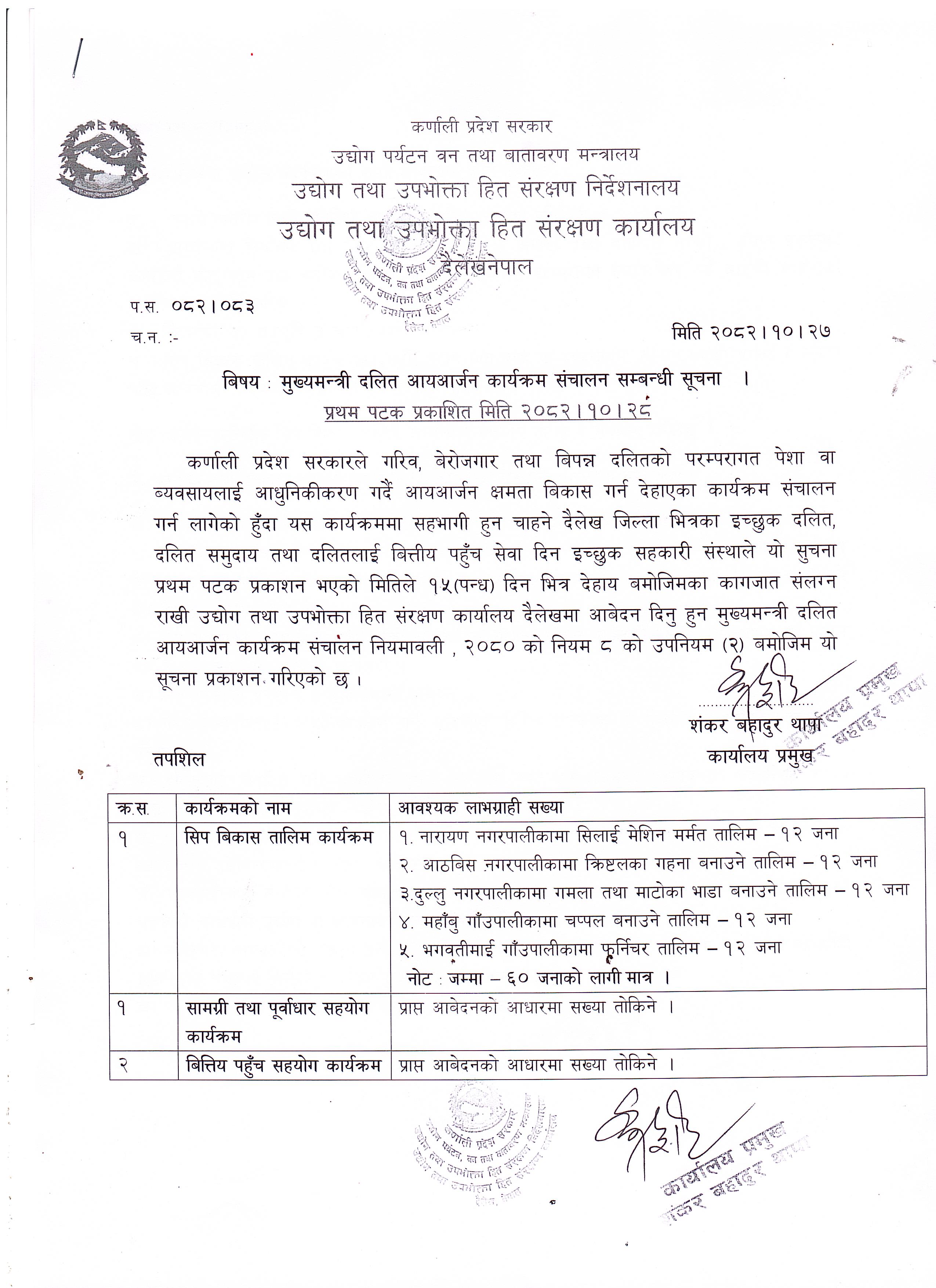 1) मुख्य मन्त्री दलित आयआर्जन कार्यक्रम संचालन सम्बन्धी सुचना (2082-08-28)